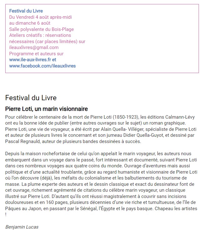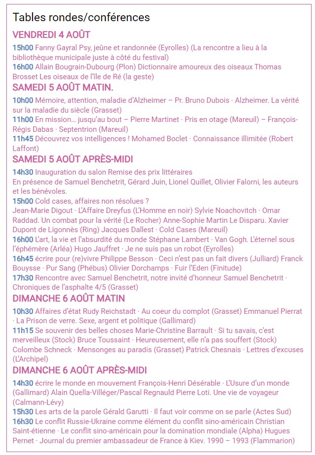 Bois-Plage : Festival du livre du vendredi 4 août au dimanche 6 août 2023 Posted on 27 juillet 2023 by AIAPL https://www.realahune.fr/le-festival-du-livre-de-lile-de-re-arrive/