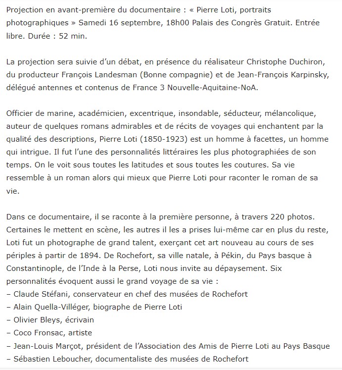 Projection en avant-première du documentaire : « Pierre Loti, portraits photographiques » Palais des Congrès de Rochefort – 16 septembre 2023 Posted on 30 juin 2022 by AIAPL https://www.unidivers.fr/event/palais-des-congres-rochefort-2023-09-16t1800000200/