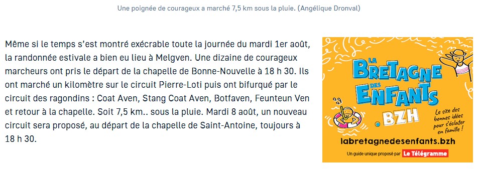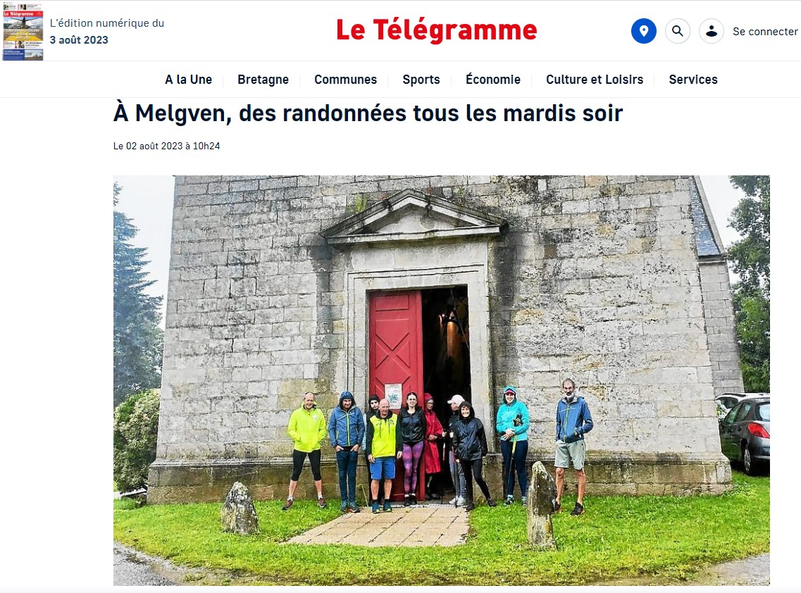 A Melgven, des randonnées tous les mardi soir Posted on 3 août 2023 by AIAPL https://www.letelegramme.fr/finistere/melgven-29140/a-melgven-des-randonnees-tous-les-mardis-soir-6404123.php