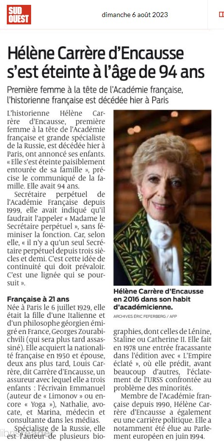 Ainsi que l’a dit Madame Carrère d’Encausse, « Les Académiciens ne meurent jamais dans la vie de l’Académie » et cette grande Dame laissera une trace brillante et indélébile dans le monde de la culture française.