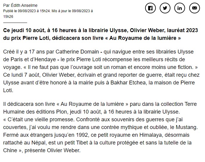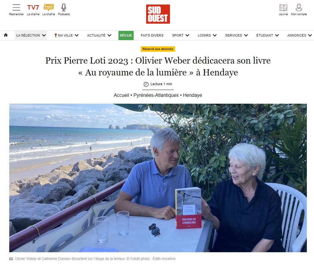 Prix Pierre Loti 2023 : Olivier Weber a dédicacé son livre « Au royaume de la lumière » à Hendaye Posted on 9 août 2023 by AIAPL de gauche à droite : Marie-Ange Gerbal présidente de l’AIAPL, Catherine Domain créatrice du prix Pierre Loti – librairie Ulysse et Olivier Weber lauréat du prix Pierre Loti 2023 https://www.sudouest.fr/pyrenees-atlantiques/hendaye/prix-pierre-loti-2023-olivier-weber-dedicacera-son-livre-au-royaume-de-la-lumiere-a-hendaye-16199230.php