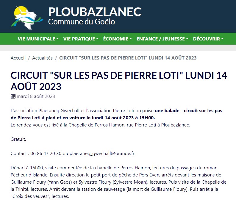 Ploubazlenec : circuit « sur les pas de Pierre Loti » lundi 14 août 2023 Posted on 1 juillet 2023 by AIAPL https://www.ploubazlanec.bzh/CIRCUIT-SUR-LES-PAS-DE-PIERRE-LOTI-LUNDI-14-AOUT-2023
