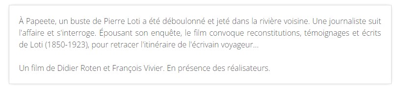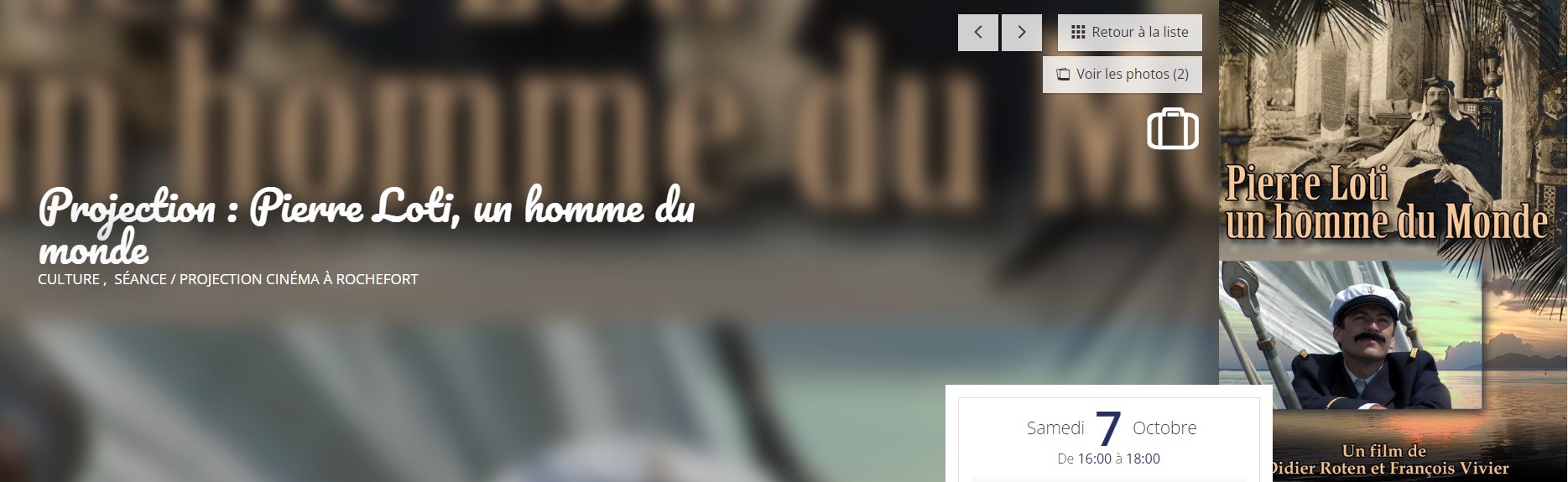 Projection : Pierre Loti, un homme du monde – 7 octobre 2023 à la médiathèque de Rochefort Posted on 25 août 2023 by AIAPL https://www.rochefort-ocean.com/organiser/agenda/agenda-complet/projection-pierre-loti-un-homme-du-monde-4352191
