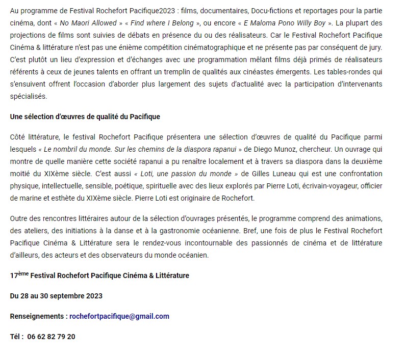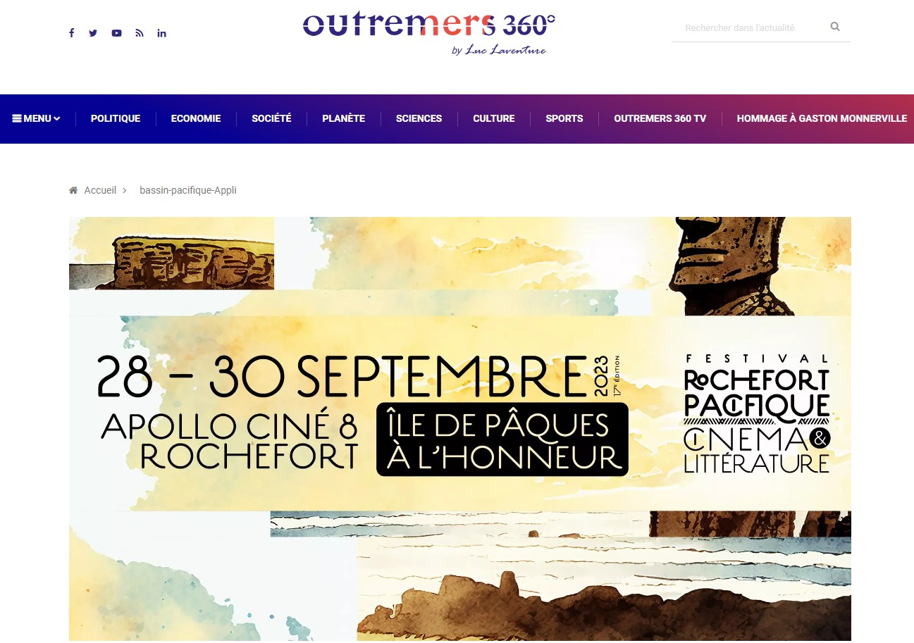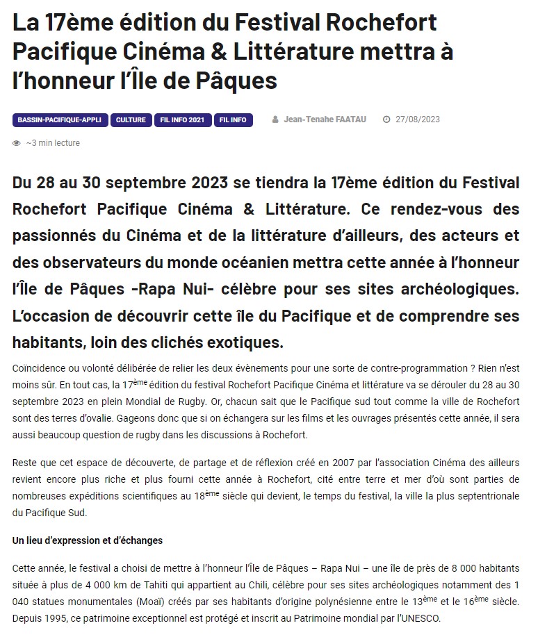 La 17ème édition du Festival Rochefort Pacifique Cinéma et Littérature mettra à l’honneur l’Île de Pâques du 28 au 30 septembre 2023 Posted on 4 juillet 2022 by AIAPL https://outremers360.com/bassin-pacifique-appli/la-17eme-edition-du-festival-rochefort-pacifique-cinema-litterature-mettra-a-lhonneur-lile-de-paques