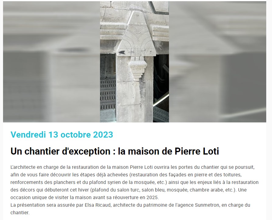 Un chantier d’exception : la maison de Pierre Loti, ouverture du chantier le 13 octobre 2023 Posted on 15 août 2023 by AIAPL