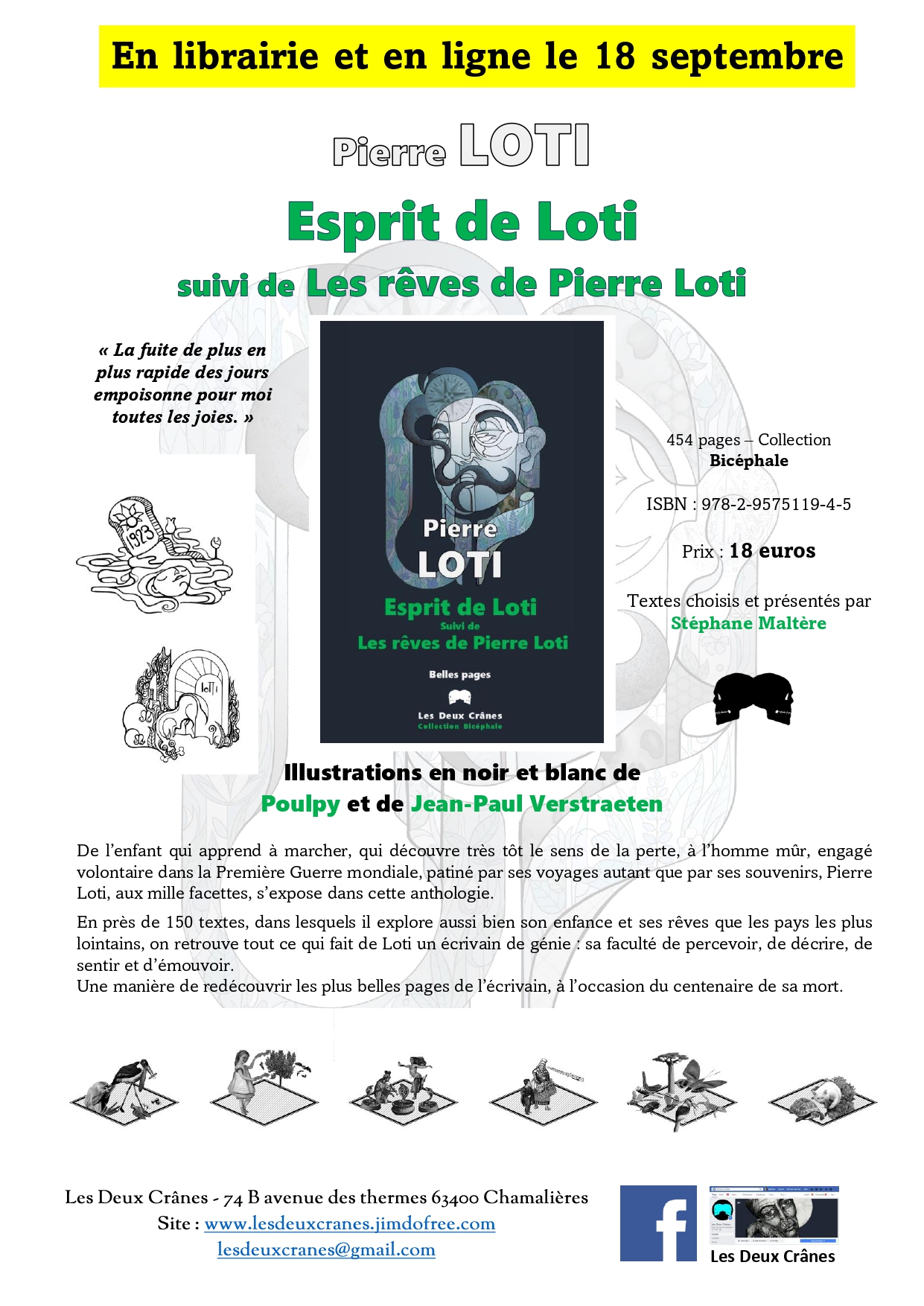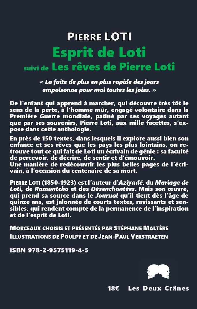Pierre LOTI – Esprit de Loti suivi de Les rêves de Pierre Loti aux éditions Les Deux Crânes – Textes choisis et présentés par Stéphane Maltère Posted on 24 septembre 2023 by AIAPL Document de presse – Esprit de Loti