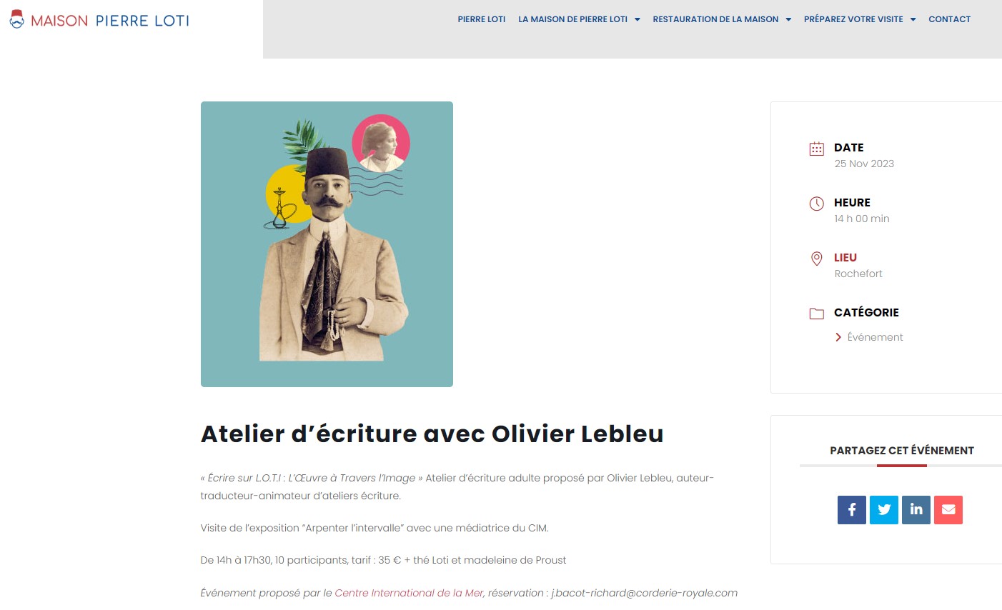 Atelier d’écriture avec Olivier Lebleu le 25 novembre 2023 au Centre International de la Mer à la Corderie Royale de Rochefort Posted on 10 juillet 2023 by AIAPL https://maisondepierreloti.fr/agenda/atelier-decriture-avec-olivier-lebleu-804/