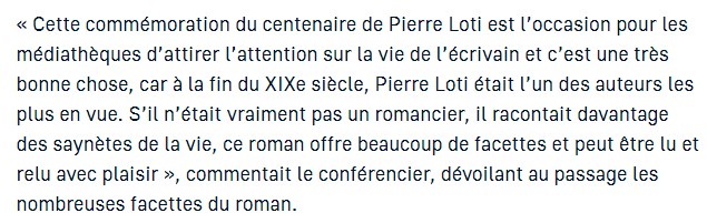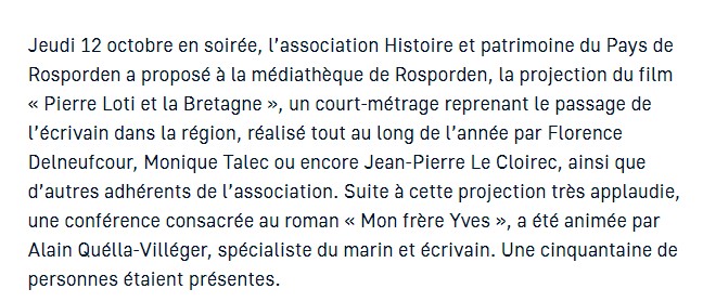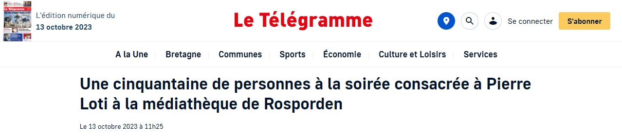 Une cinquantaine de personnes à la soirée consacrée à Pierre Loti à la médiathèque de Rosporden Posted on 13 octobre 2023 by AIAPL https://www.letelegramme.fr/finistere/rosporden-29140/une-cinquantaine-de-personnes-a-la-soiree-consacree-a-pierre-loti-a-la-mediatheque-de-rosporden-6448053.php
