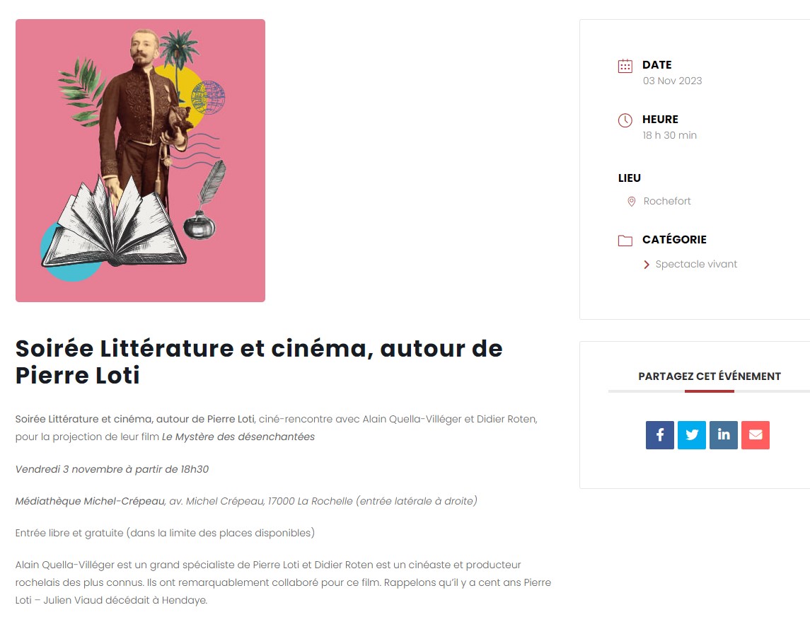 Médiathèque de La Rochelle, vendredi 3 novembre 2023, 18h30, « Le Mystère des Désenchantées » Posted on 26 juillet 2023 by AIAPL Projection du film « Le Mystère des Désenchantées » en présence du réalisateur Didier Roten et d’Alain Quella-Villéger, biographe de Pierre Loti et coscénariste du film avec Didier Roten & François Vivier.