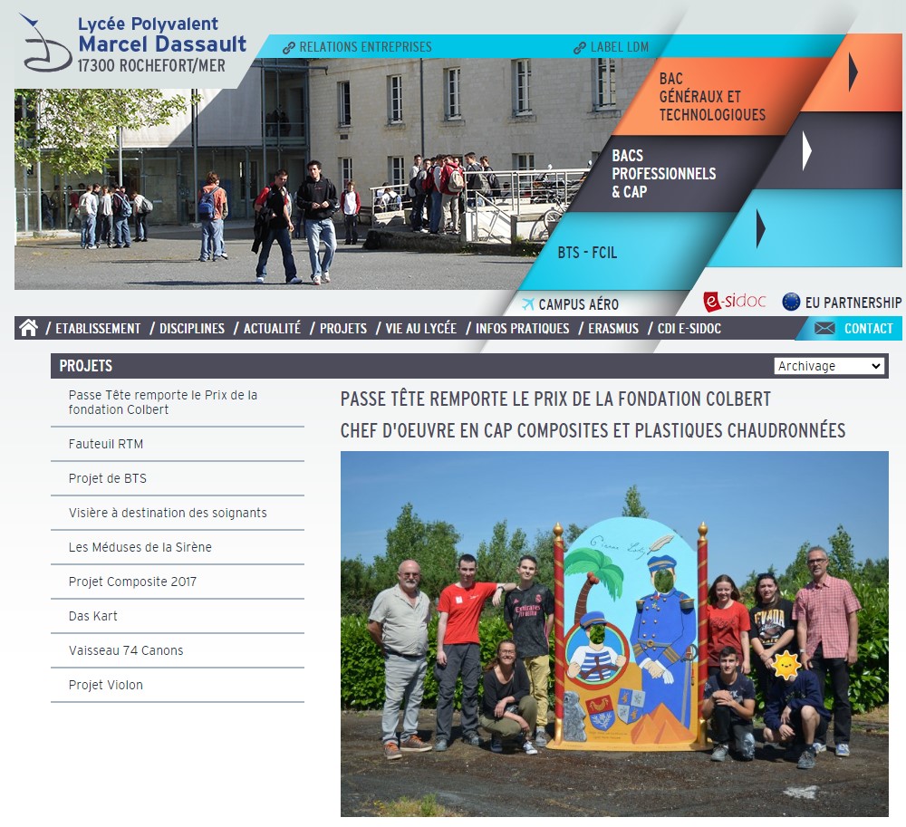 Lycée Dassault à Rochefort : Passe-tête remporte le prix de la Fondation Colbert Posted on 28 octobre 2023 by AIAPL https://www.lycee-marcel-dassault.fr/projets/passe-tete.html