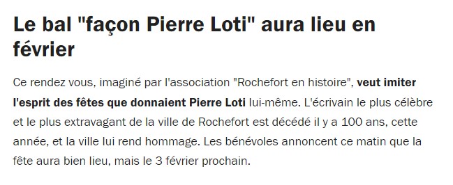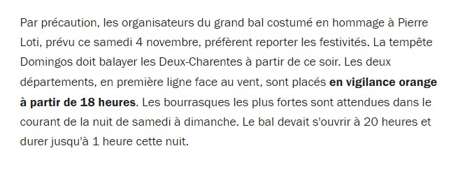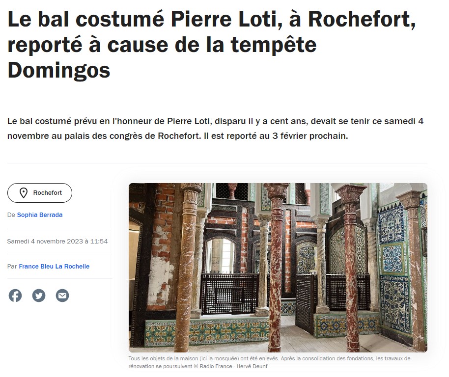Le bal costumé Pierre Loti, à Rochefort, reporté à cause de la tempête Domingos Posted on 5 novembre 2023 by AIAPL https://www.francebleu.fr/infos/societe/le-bal-costume-pierre-loti-reporte-a-cause-de-la-tempete-domingos-3150647