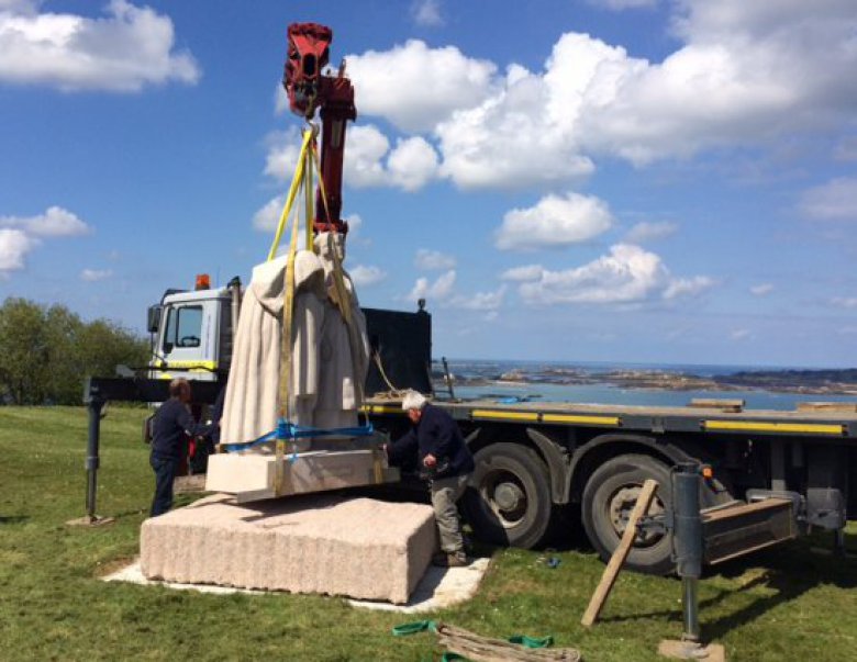 La statue (2,50 m de hauteur, 6 tonnes et 1 500 heures de travail) a donc enfin été installée jeudi à Lan Vras, au-dessus de Beg Nod, avec, par beau temps, vue sur les Roches-Douvres.