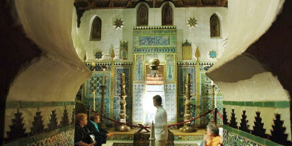 Rapporté de Damas par Loti en 1894, il est dit que le plafond de la mosquée proviendrait d’une demeure privée, et non, comme le voudrait la légende, de la grande mosquée des Ommeyades. Son répertoire décoratif et sa gamme chromatique en font un élément représentatif du style dit « ajami ». Il est aujourd’hui victime d’une fragilisation importante, due à l’attaque du bois par des larves d’insectes xylophages. On estime que les galeries creusées par ces larves auraient fait perdre au support de bois près de 30% de son poids. L’ouvrage nécessite des travaux d’urgence.