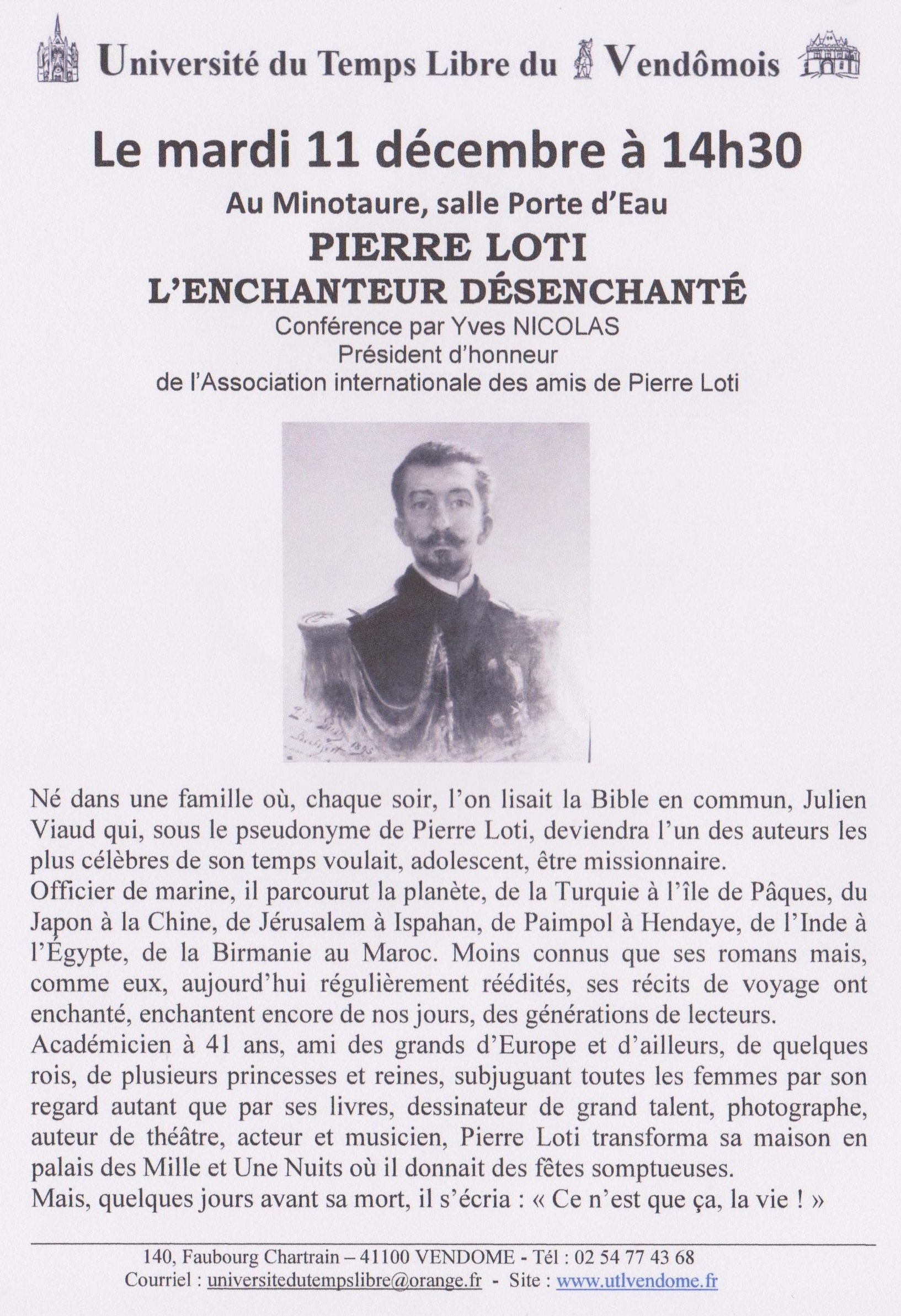 Conférence « PIERRE LOTI L’ENCHANTEUR DESENCHANTE » par Yves NICOLAS le 11 décembre 2018 Posted on 4 juillet 2018 by AIAPL Cliquez sur « articles précédents » situés tout en bas de cette page pour consulter toutes les actualités