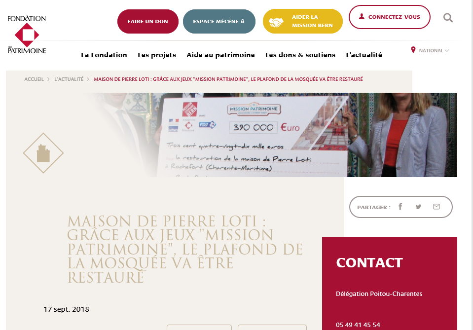 Maison de Pierre Loti : grâce aux Jeux « Mission Patrimoine », le plafond de la mosquée va être restauré Posted on 20 septembre 2018 by AIAPL Pour en savoir plus, cliquez sur le lien suivant : https://www.fondation-patrimoine.org/l-actualite/liste-des-actualites/maison-de-pierre-loti-grace-au-x-jeux-mission-patrimoine-le-plafond-de-la-mosquee-va-etre-restaure