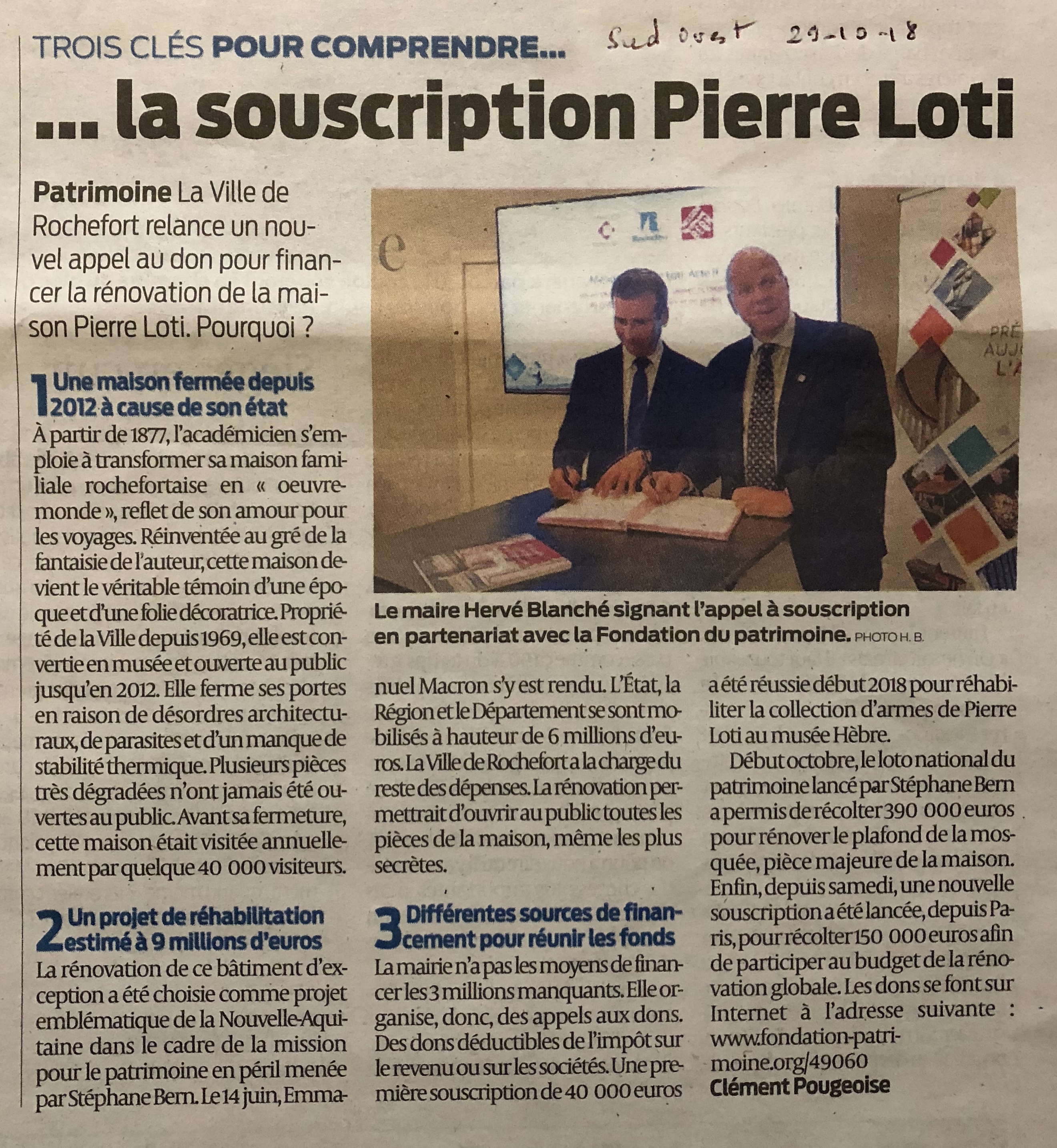 Nouvelle souscription pour la maison de Pierre Loti Posted on 31 octobre 2018 by AIAPL Cliquez sur « articles précédents » situés tout en bas de cette page pour consulter toutes les actualités