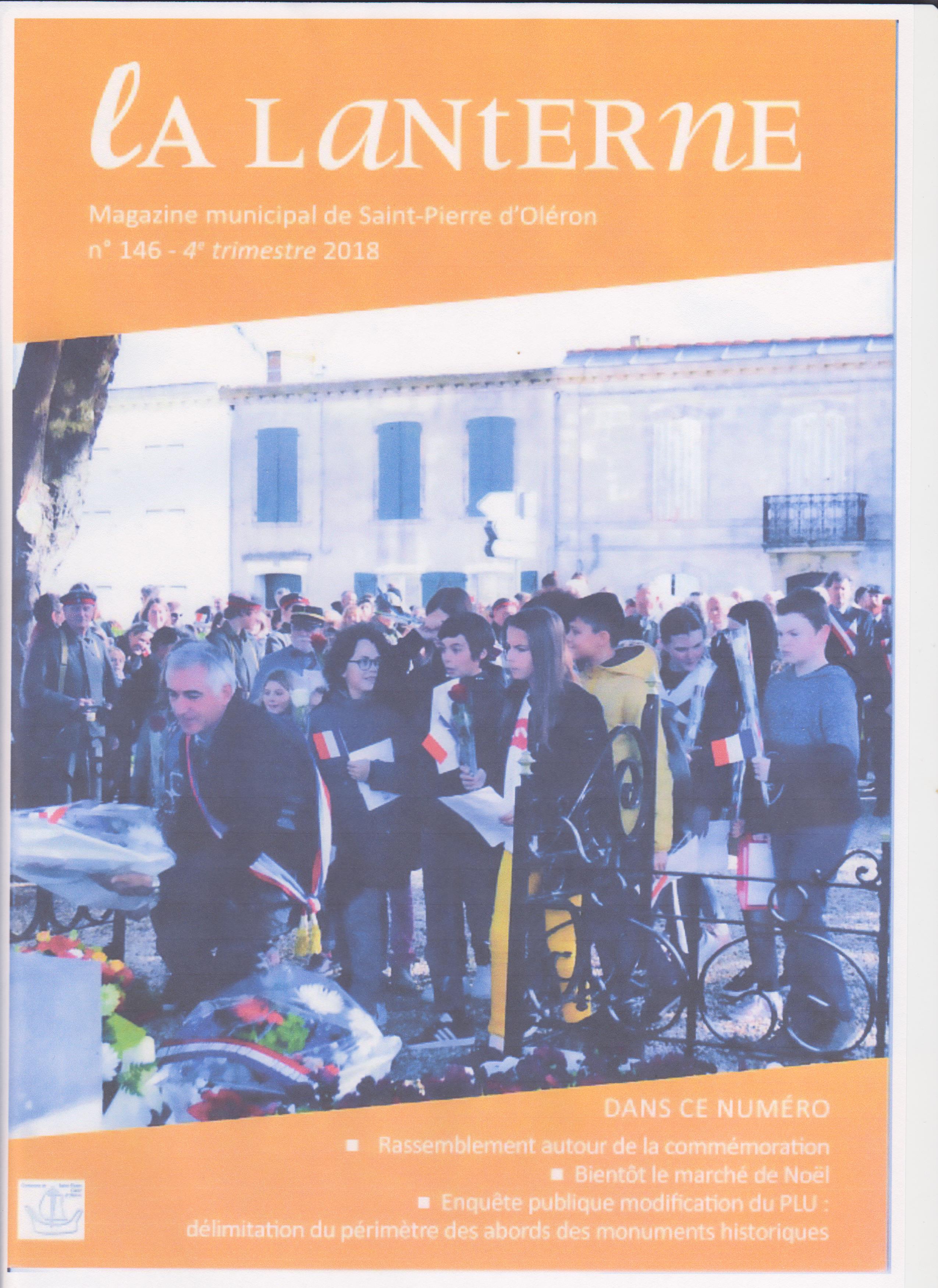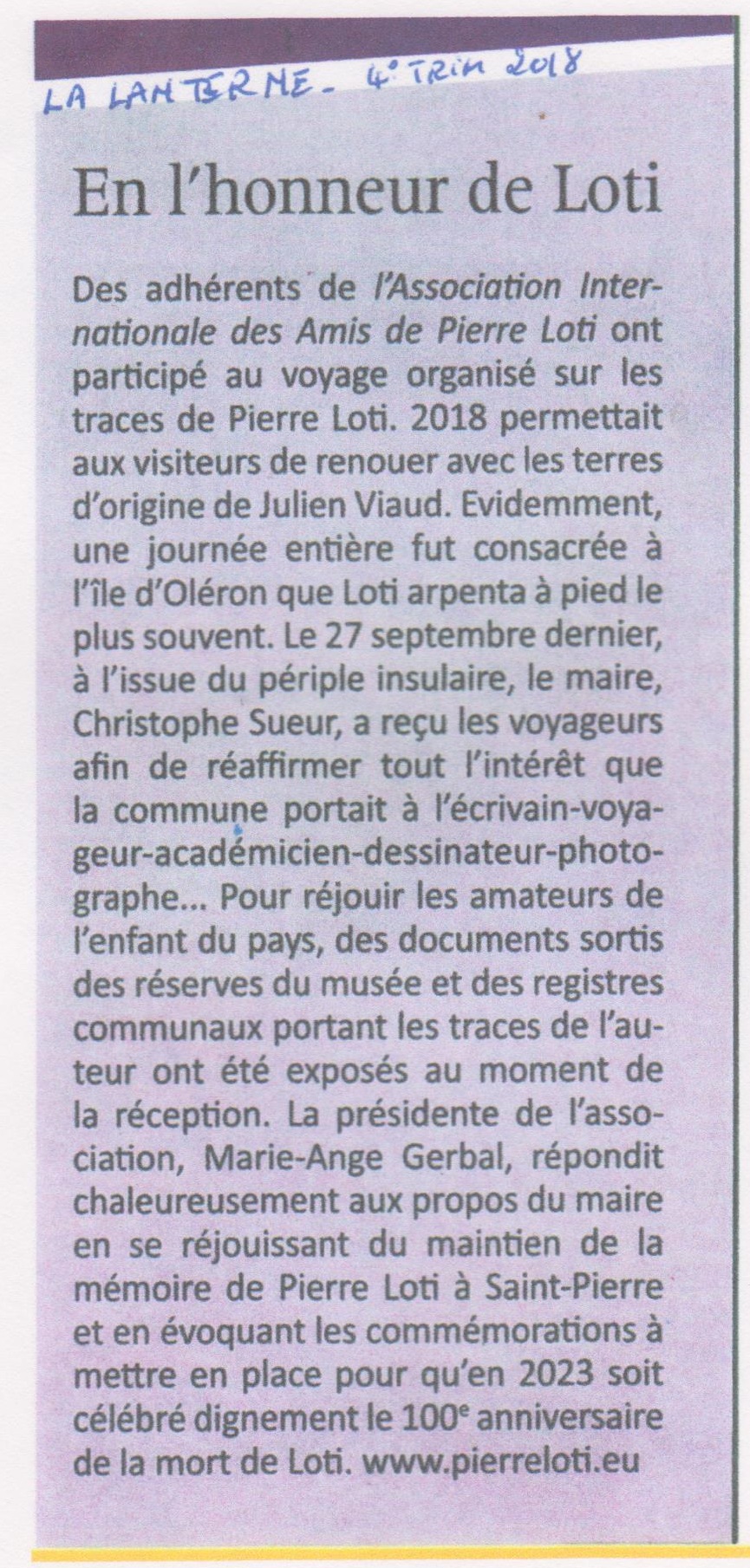 Le n° 146 du 4e trimestre 2018 de La Lanterne, magazine municipal de Saint-Pierre d’Oléron, donne un bref article sur le voyage 2018 de notre Association et la réception de notre groupe par le maire de Saint Pierre d’Oléron Christophe Sueur.