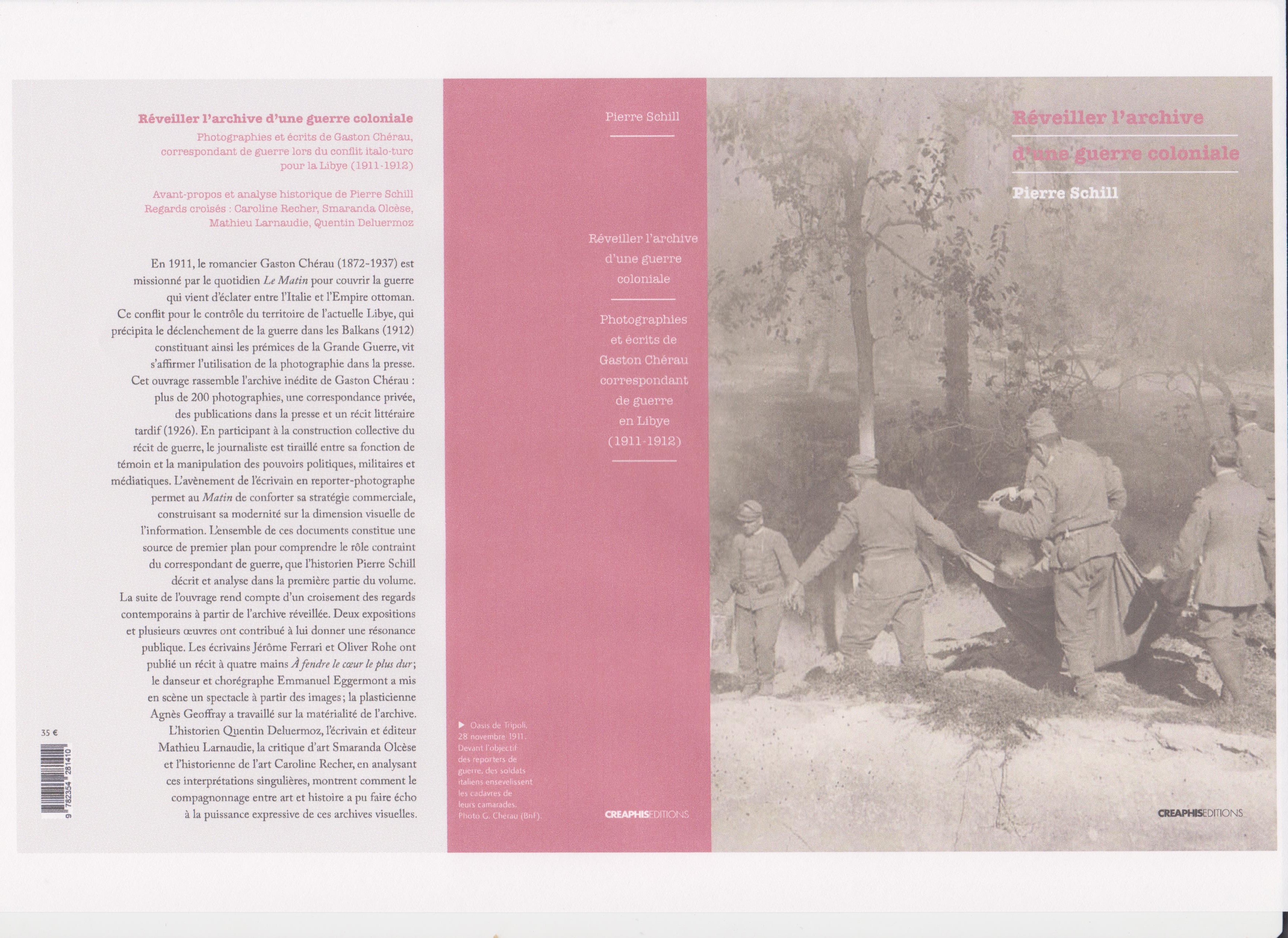 Pierre Schill, Réveiller l’archive d’une guerre coloniale. Photographies et écrits de Gaston Chérau, correspondant de guerre lors du conflit italo-turc pour la Libye (1911-1912), Créaphis, 2018, 480 p. Avec des contributions de Caroline Recher, Smaranda Olcèse, Mathieu Larnaudie et Quentin Deluermoz. Relié, cartonné, 165 x 225 mm, 230 photographies, plusieurs papiers de création, 35 euros. Diffusion INTERFORUM ; ISBN 978–2–35428–141–0 http://www.editions-creaphis.com/ https://bnf.hypotheses.org/6789