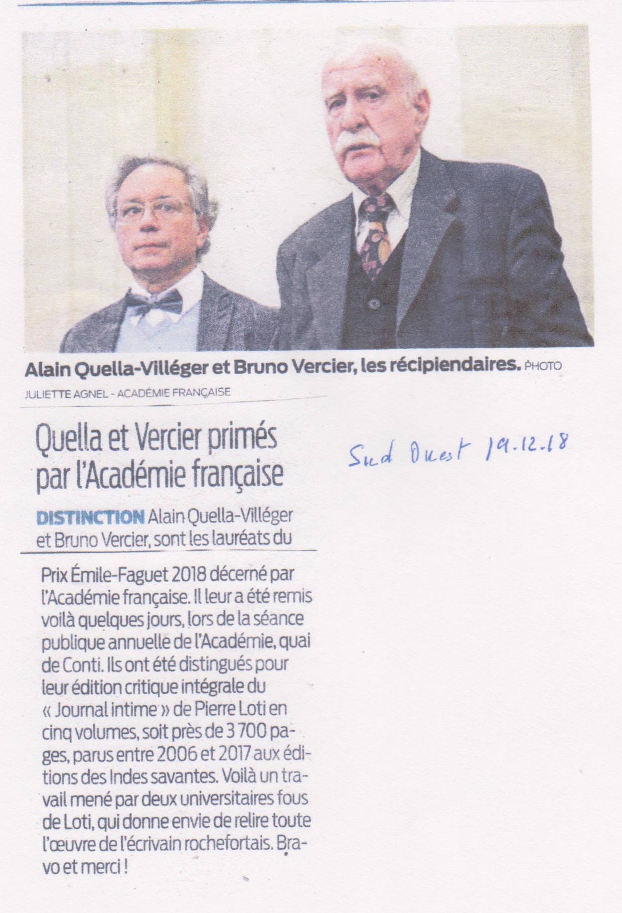 Alain Quella-Villéger et Bruno Vercier primés par l’Académie française Posted on 20 décembre 2018 by AIAPL Cliquez sur « articles précédents » situés tout en bas de cette page pour consulter toutes les actualités