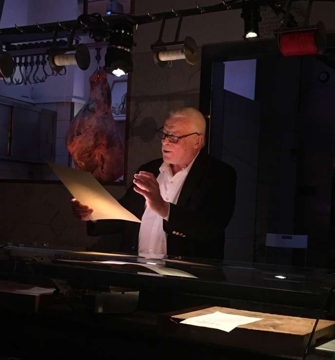 Accrochée derrière l’acteur, une énorme cuisse de bœuf limousine magnifiquement éclairée dans l’obscurité par l’éclairagiste de Weber. Et sur les étagères des livres du boucher, justement titrés « Morceaux choisis ». Weber est venu avec les siens, des textes posés sur la balance et sur les planches de travail. Il interprète d’abord des classiques comme « le petit bruit de l’œuf dur », de Prévert (le poème La Grasse Matinée) ou le passage de la madeleine de Proustdans Du côté de chez Swann.