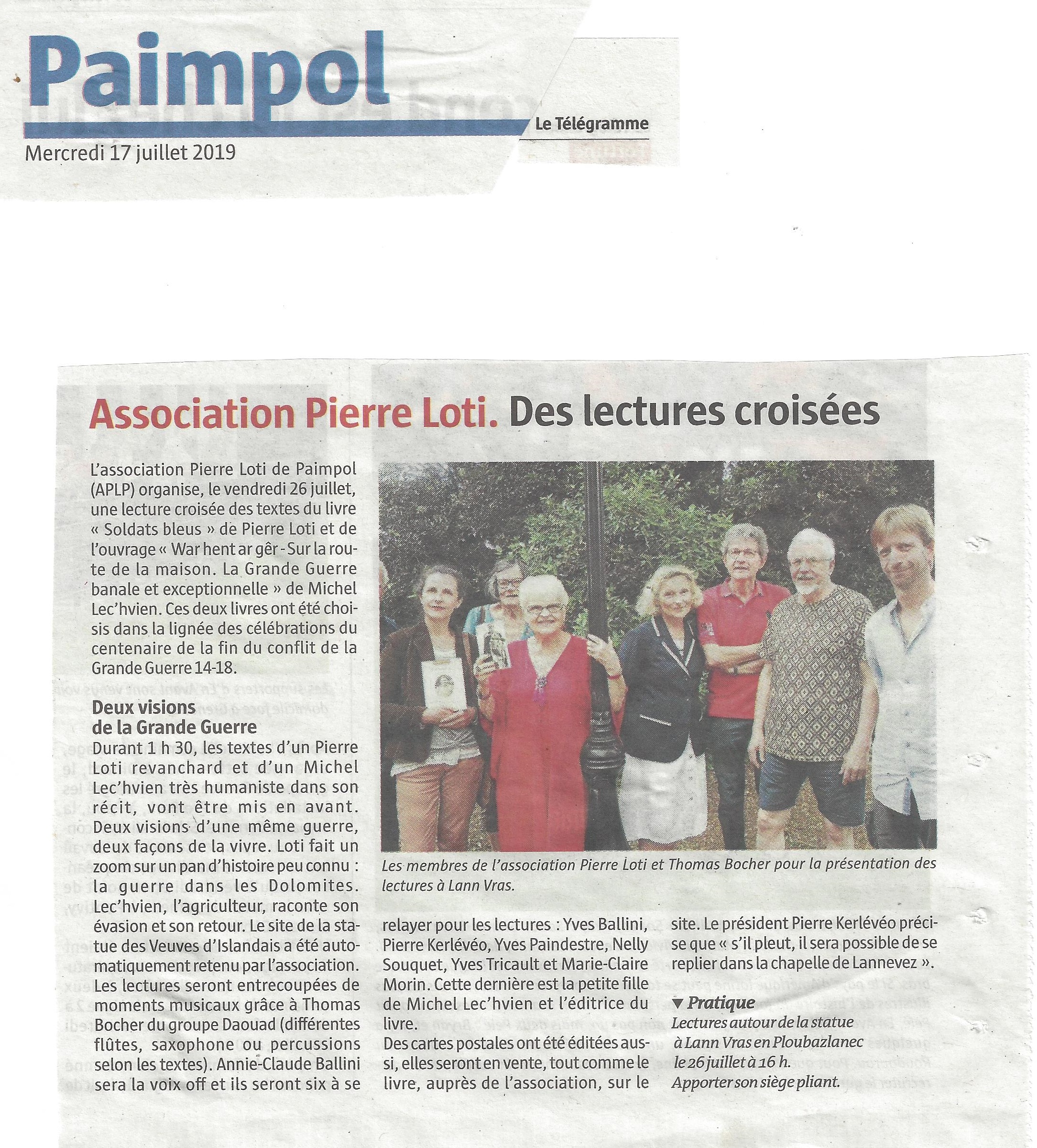 L’APLP organise le 26 juillet 2019 une lecture croisée des textes du livre « Soldats bleus » de Pierre Loti. Posted on 25 juillet 2019 by AIAPL Cliquez sur « articles précédents » situés tout en bas de cette page pour consulter toutes les actualités