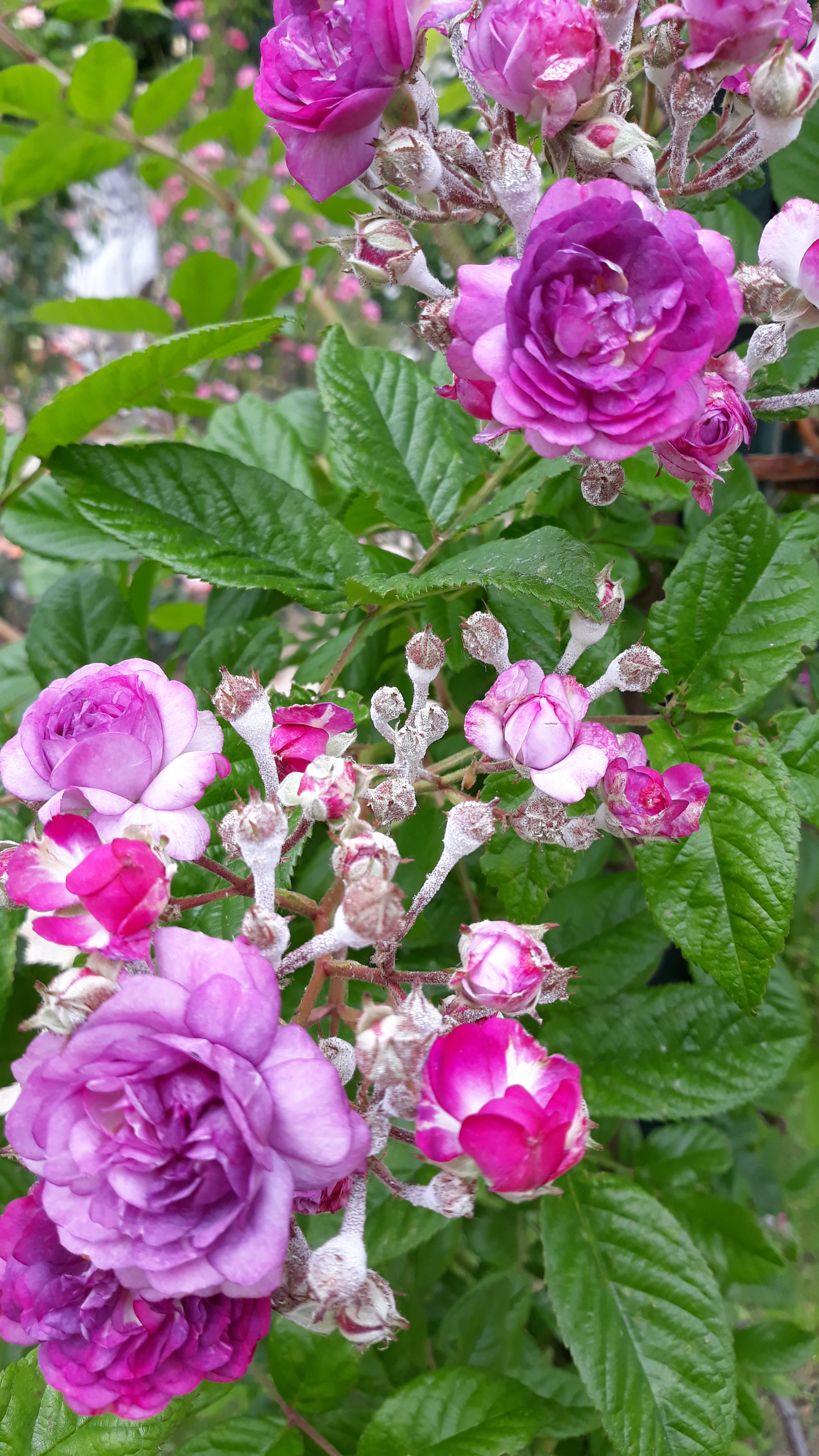 C’est un rosier grimpant, inerme, aux bouquets de petites fleurs doubles lilas parme évoluant au gris mauve légèrement parfumées et non remontant.
