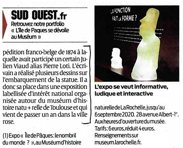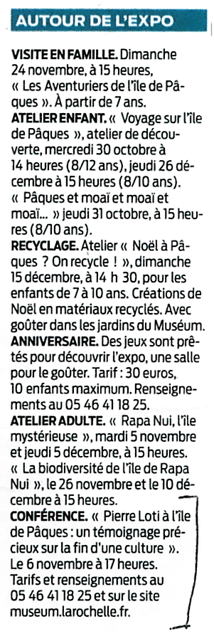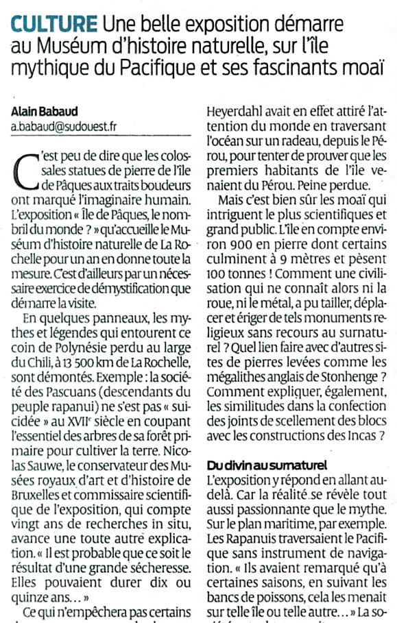 Conférence 6 novembre 2019 « Pierre Loti à l’île de Pâques : un témoignage précieux sur la fin d’une culture » Posted on 10 avril 2019 by AIAPL L’île de Pâques, derrière le mythe Nicolas Sauwe, conservateur des Musées d’art et d’histoire de Bruxelles, est le commissaire scientifique de l’expo. PH. R. Augé