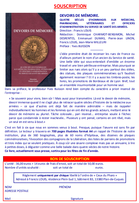 Francis LOUIS, Médecin militaire, spécialiste de médecine tropicale. – A été en poste à l’Institut de médecine tropicale du Service de santé des Armées, Marseille. – Président de l’association Ceux du PHARO (en 2013)