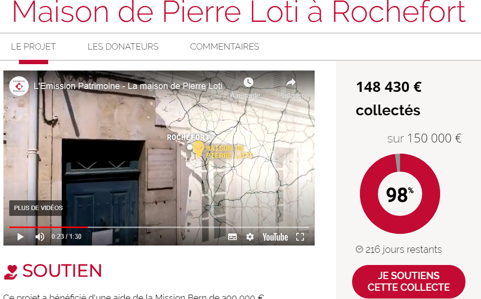 Le projet de restauration permettra la réouverture de la maison-musée en 2022-2023, à l’occasion du centenaire de la mort de Pierre Loti Posted on 31 mai 2020 by AIAPL Lire l’article : https://soutenir.fondation-patrimoine.org/projects/maison-de-pierre-loti-a-rochefort-fr?_ga=2.219950928.830338933.1590480447-1434433804.1589880705