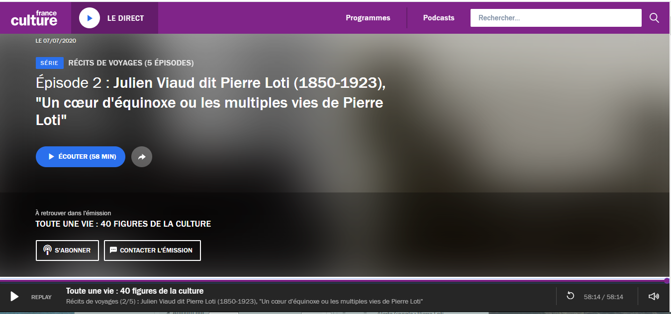 France Culture… « un coeur d’équinoxe ou les multiples vies de Pierre Loti » Posted on 7 juillet 2020 by AIAPL Cliquez sur le lien https://www.franceculture.fr/emissions/une-vie-une-oeuvre/recits-de-voyages-26-julien-viaud-dit-pierre-loti-1850-1923-un-coeur-dequinoxe-ou-les-multiples-vies