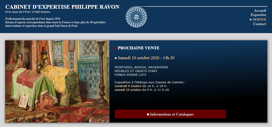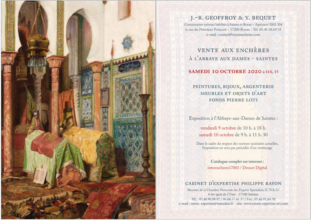 Vente aux enchères FONDS PIERRE LOTI le 10 octobre 2020 à Saintes Posted on 1 octobre 2020 by AIAPL Cliquez : http://www.ravon-expertise-art.com/ventes-encheres-philippe-ravon.html