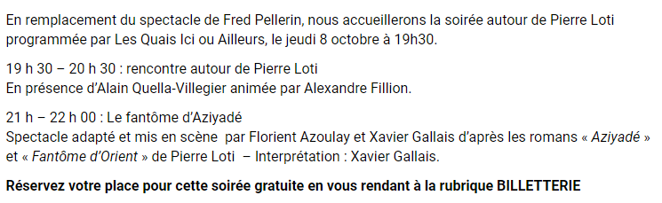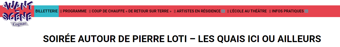 Soirée Pierre Loti à Cognac le 8 octobre 2020 Posted on 6 octobre 2020 by AIAPL Théâtre l’Avant Scène 1, place Robert Schuman Cognac – 05 45 82 17 24 www.avantscene.com