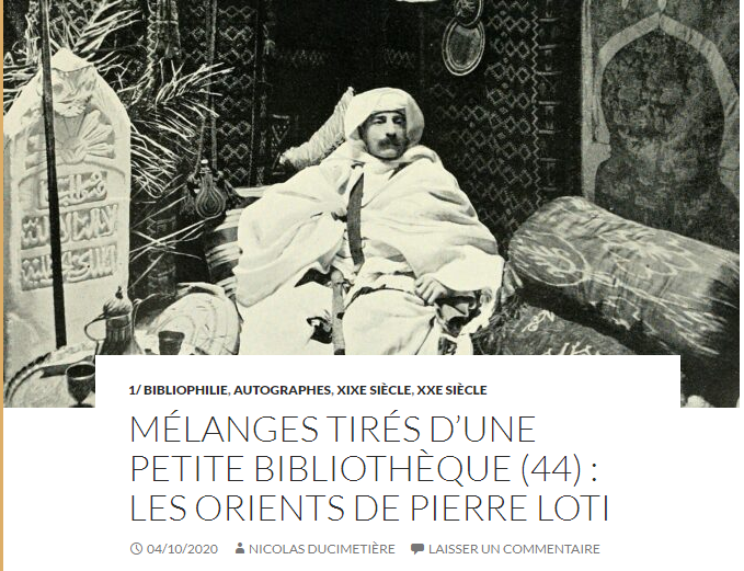 Mélanges tirés d’une petite bibliothèque (44) : Les Orients de Pierre Loti Posted on 7 octobre 2020 by AIAPL Cliquez sur le lien : https://mabiblio.hypotheses.org/5147