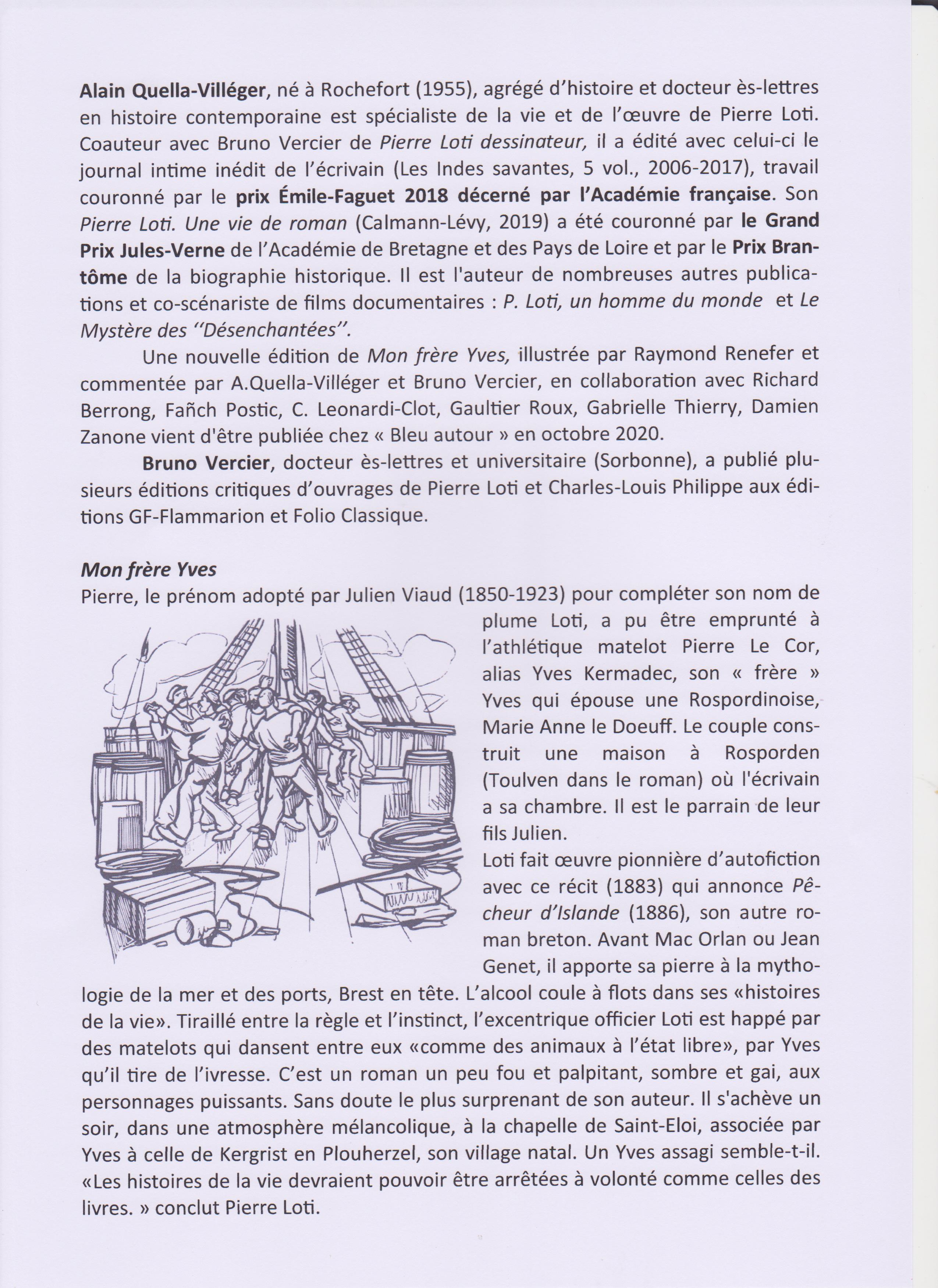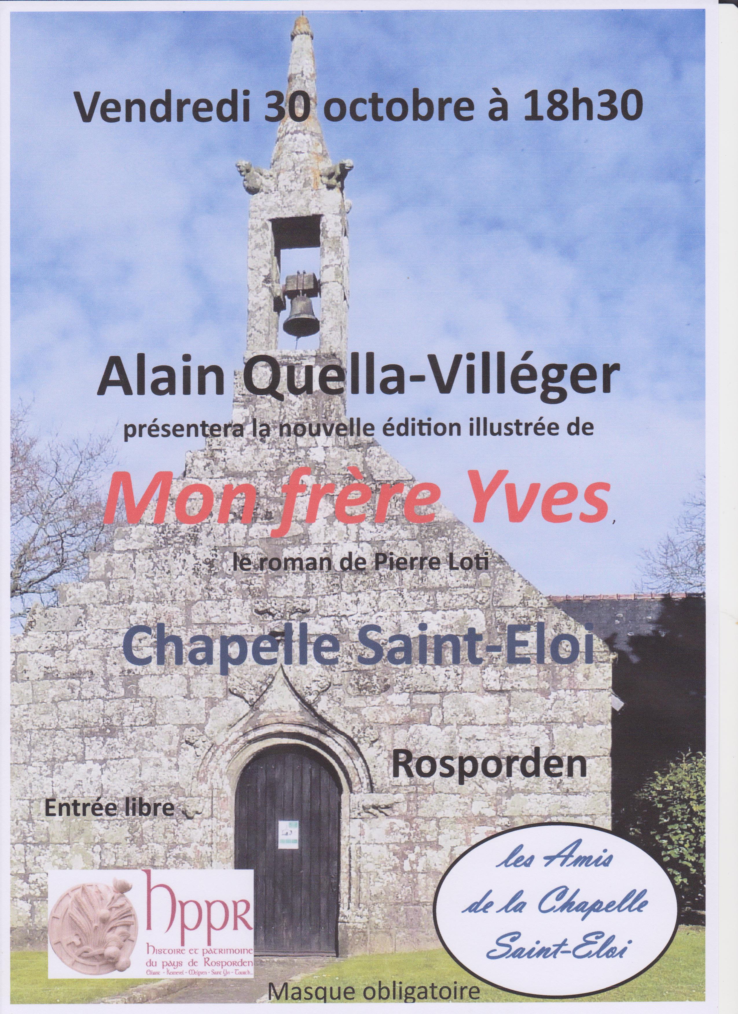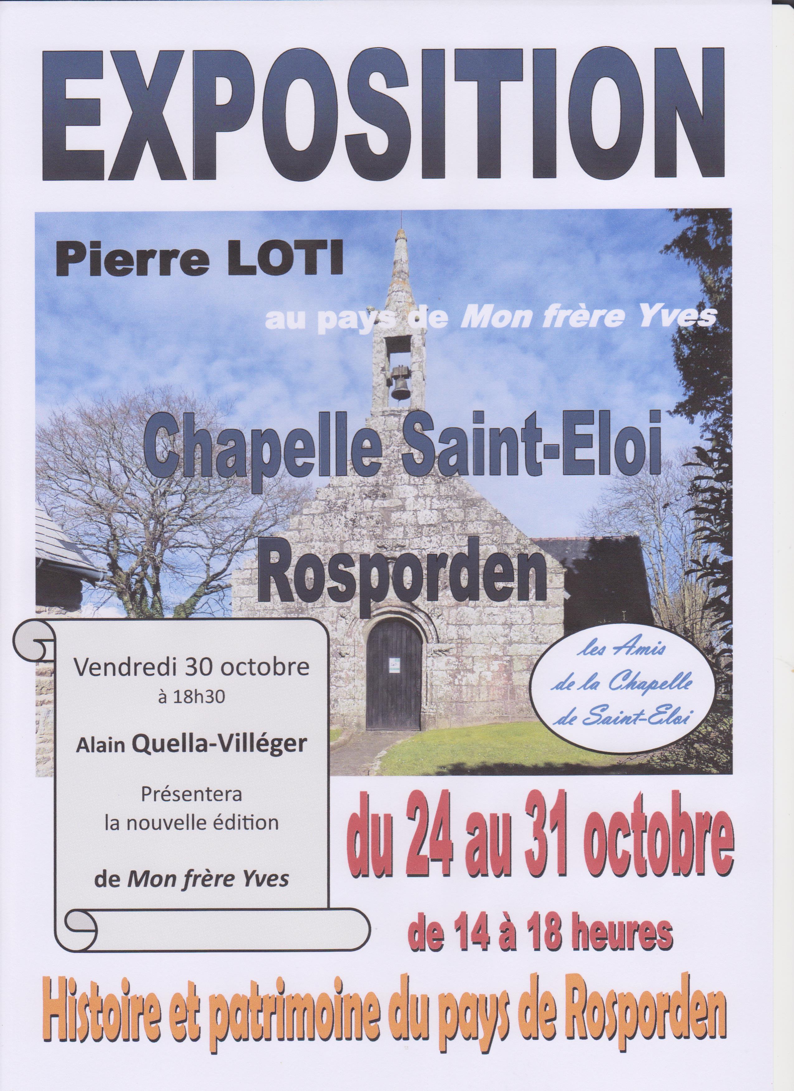 Exposition Pierre Loti au Pays de mon Frères Yves à Rosporden du 24 au 31 octobre et présentation de la nouvelle édition de « Mon frère Yves » par Alain Quella-Villéger le 30 octobre 2020 Posted on 18 octobre 2020 by AIAPL Dates du 24 octobre au 31 octobre 2020 de 14:00:00 à 18:00:00 Contact Téléphone : +33 2 98 06 87 90 Adresse Chapelle Saint-Eloi , Rosporden organisée par l’association HPPR