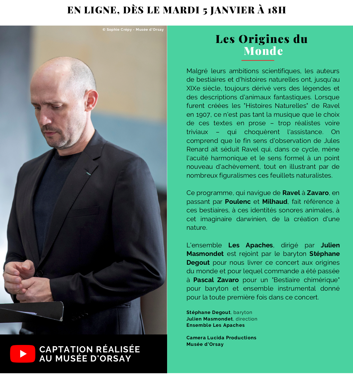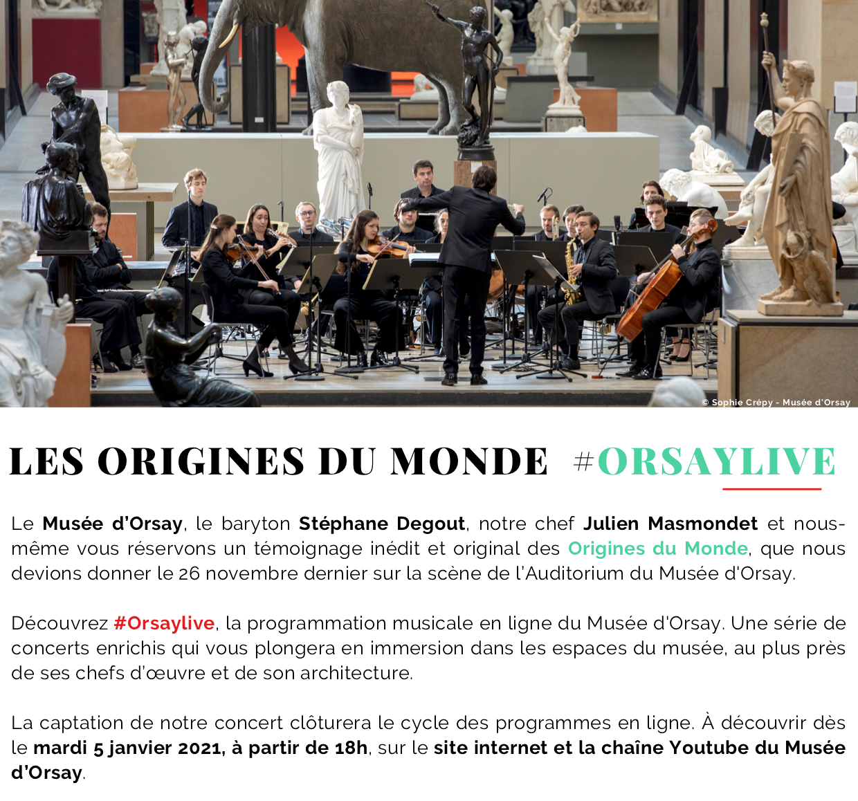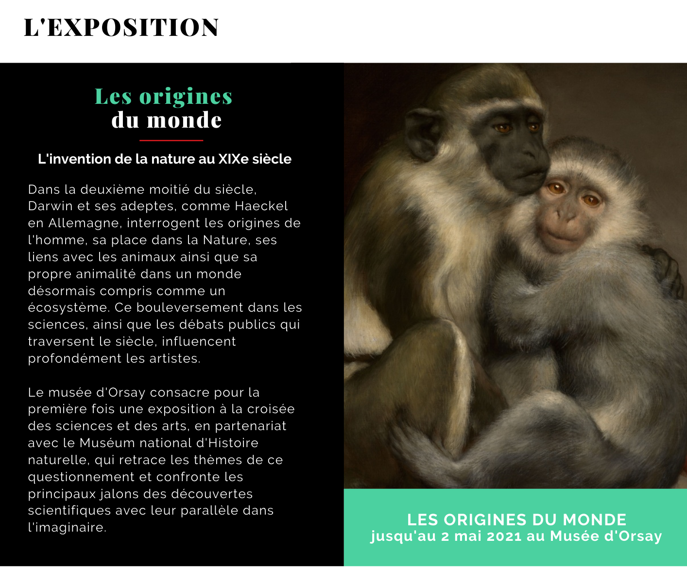 LES ORIGINES DU MONDE #Orsaylive – Save the date Posted on 31 décembre 2020 by AIAPL https://www.musee-orsay.fr/fr/evenements/regardsnumeriques/orsaylive/les-apaches.html https://m.musee-orsay.fr/fr/expositions/article/les-origines-du-monde-50525.html