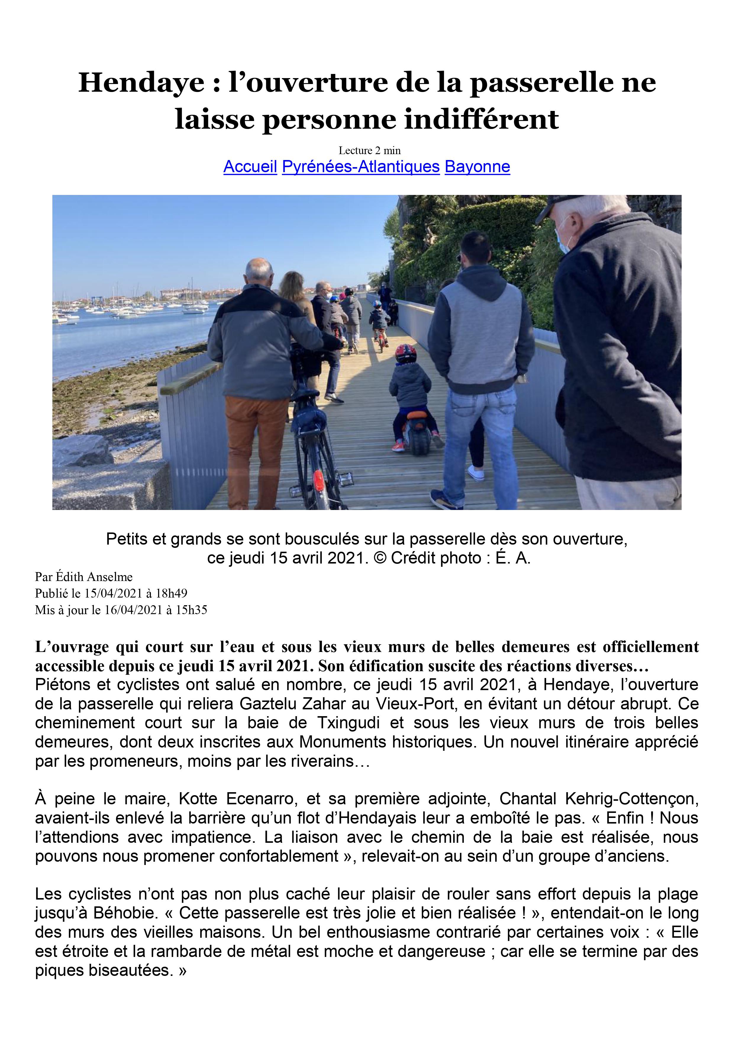 Hendaye : l’ouverture de la passerelle ne laisse personne indifférent Posted on 17 avril 2021 by AIAPL