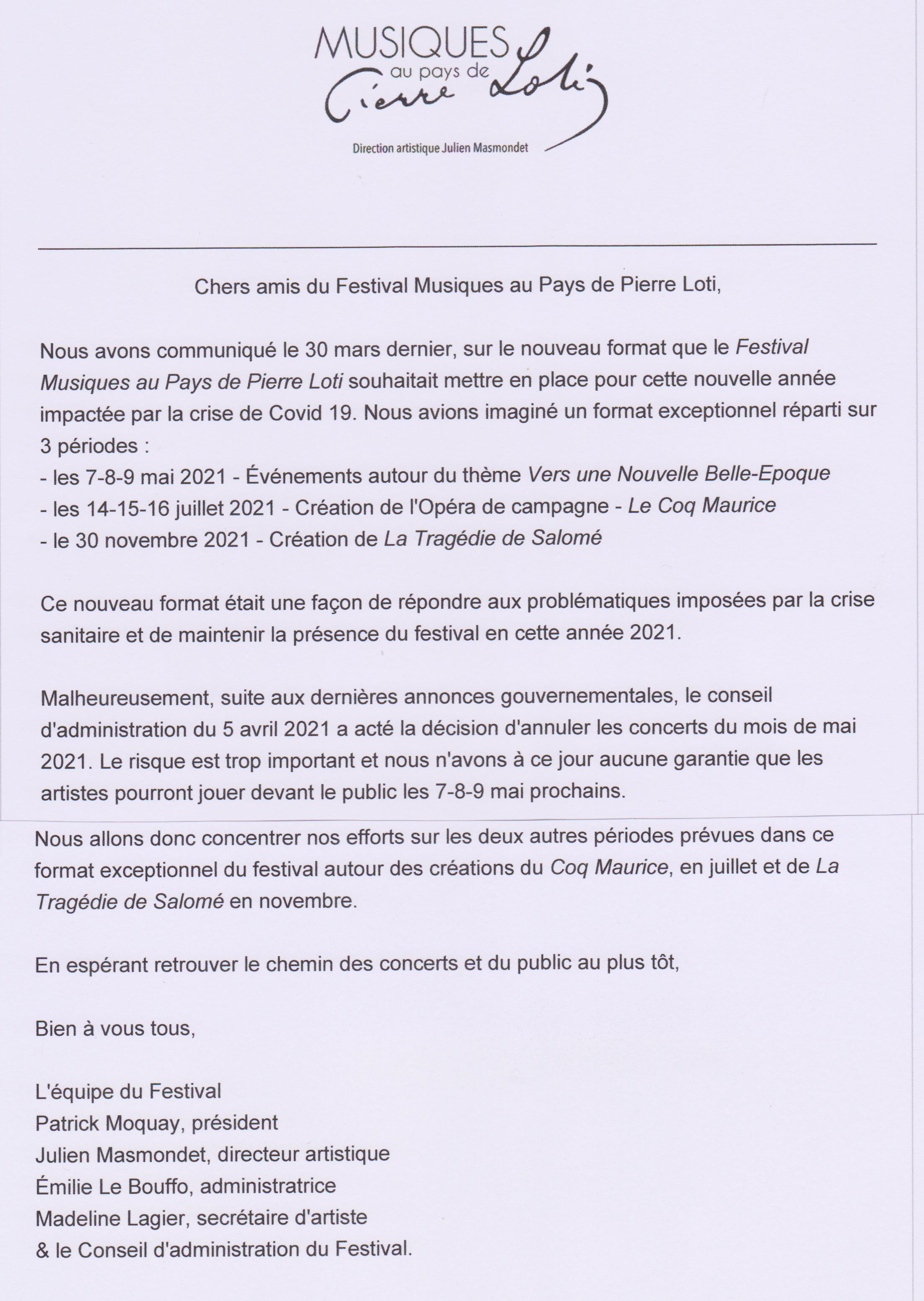Festival Musiques au Pays de Pierre Loti : annulation de la programmation de mai 2021 Posted on 21 avril 2021 by AIAPL