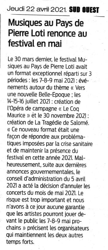 Musiques au Pays de Pierre Loti renonce au festival en mai Posted on 25 avril 2021 by AIAPL Article transmis par Christian Ehrmann